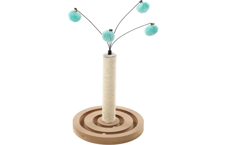 Ce griffoir est parfait pour ton chat ! Fabriqué en peluche douce et équipé d'une corde à griffer en sisal. Avec une base épaisse et un diamètre de 6 cm, ce griffoir est stable et solide. Le circuit de balles et les jouets avec clochette pour chat ajoutent du plaisir de jeu supplémentaire.
